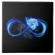 Luminous infinity symbol with glowing, beautiful, lushly blooming rose made of blue flames on black background.