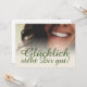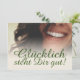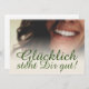 Glücklich, Dir, instinto! Kompliment Karte mit lachendem Frauengesicht und handschriftlichen Grüßen auf der Vorderseite der Karte. Restliche Flächen stehen zur freien Verfügung.