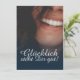 Glücklich, Dir, instinto! Kompliment Karte mit lachendem Frauengesicht und handschriftlichen Grüßen auf der Vorderseite der Karte. Restliche Flächen stehen zur freien Verfügung.