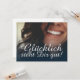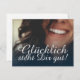 Glücklich, Dir, instinto! Kompliment Karte mit lachendem Frauengesicht und handschriftlichen Grüßen auf der Vorderseite der Karte. Restliche Flächen stehen zur freien Verfügung.