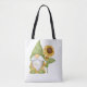 Gnome holding a sunflower and notes on a tote bag great for conversation while out shopping or just browsing around town