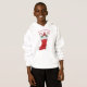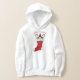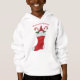 A camisola de capuz desta criança tem um gnomo divertido com um chapéu vermelho escuro e pontiagudo de Natal vermelho e branco entre duas canetas doces e folhas verdes e ocas. Personalize o texto Feliz Natal com o modelo.