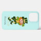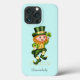 Gnomo verde-sorte bonito segurando um trevo sobre fundo azul-turquesa claro. O texto pode ser personalizado.