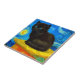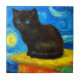 Azulejo com um gato Van Gogh no estilo da Noite Estrelada! Um gatinho negro e fofo permeia uma mesa contra um céu azul e uma lua amarela. Um presente perfeito para amantes de gatos e colecionadores de arte holandeses!