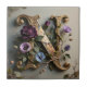 This design is special for its striking contrast between the opulent gold scrollwork and the prominent cracked, antique patina on the central part of the letter 'N'. It is richly decorated with a vibrant mix of florals, including a deep purple rose, pale blue poppy, and purple thistle, all wrapped in mossy vines. This creates a dimensional, heirloom-quality botanical monogram.