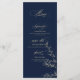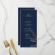 A wedding menu in gold and navy with botanical elements