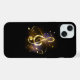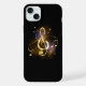 Jewelry, gold, musical treble clef with golden notes and stars on black glowing background.