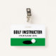 Instrutor Golf, crachá com clipe ou cordão de jardim. Marca de crachá de nome reversível para assistente profissional de campo de golfe. Modelo personalizado para o clube de golfe ou o pessoal de condução. Tipografia moderna com design verde e bola. Excelente de golfista, treinador, treinador, treinador, funcionarios, marechal, funcionários, colegas de trabalho, colegas de golfe, voluntários, ateliês de compro, carregador, representante de vendas, dono de loja de esportes, jogadores, etc.