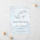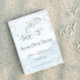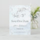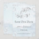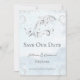 Personalize um anúncio de casamento único com um golfinho prateado. O design de lançamento apresenta um golfinho metálico estilizado contra um fundo de ondas do oceano silenciadas adornado com rolhas elegantes e texto que você pode personalizar com seus detalhes de data de casamento. Salve ainda o anúncio de data disponível para este design em várias cores.