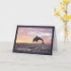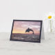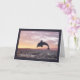 Golfinho de silhueta saltando do oceano em frente a um pôr do sol e pousando com uma fronteira roxa. Cartão de aniversário de excelente para o amante de os animais. 2014 © Design por Julia Bryant.