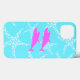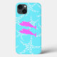 Dois golfinhos cor-de-rosa claro sobre um padrão de fundo de formas azul-turquesa e de peixe-estrela branco-ponto. Uma divertida e brilhante sob o tema água design.