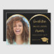 Uma foto magnética Salve o cartão de data de uma festa de formatura. Na frente: adicione sua própria foto vertical do formando. Fotografia do arco dourado. Um fundo preto, texto de ouro. Modelos para um nome e data. O nome e o texto: Salvar a Data são escritos com um script de estilo moderno com letra manual. Com um boné, tassel superior.