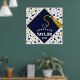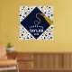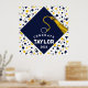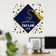 Poster de festa de formatura de criativa com marinho azul formando boné com fita-ouro sobre fundo confetti. Para personalizar, edite texto e adicione seu nome e ano de classe de mais velho.
