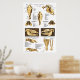 Poster de anatomia do crânio equino criada usando 11 ilustrações de safra. O poster mostra as vistas anterior e lateral do crânio. As seções e seções transversais apresentam as estruturas anatômicas internas e os seios sinérgicos. Maxila superior e inferior com dentes e seções mostrando a disposição interna dos dentes.