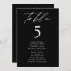 Gráfico elegante de assentos de casamento com "mesa" exibido em um roteiro de caligrafia branca com o número da tabela e os nomes de convidados mostrados abaixo em um plano de fundo preto. O design repete atrás. Para solicitar o gráfico de número de tabela, edite cada cartão com o número da tabela e os nomes de convidado e adicione-o ao carrinho. Projetado para coordenar com a nossa coleção de casamento do Modern Elegance.
