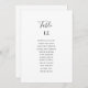 Este simples gráfico elegante de números de mesa é perfeito para a sua recepção de casamento moderna minimalista a preto e branco. O design apresenta fonte contemporânea mínima acompanhada de caligrafia formal. Mantenha-o como está, ou escolha personalizá-lo com seu próprio trabalho de arte ou fotos!