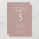 Gráfico elegante de assentos de casamento com "mesa" exibido em um roteiro de caligrafia branca com o número da tabela e os nomes de convidados mostrados abaixo em um fundo rosa empoeirado. O design repete atrás. Para solicitar o gráfico de número de tabela, edite cada cartão com o número da tabela e os nomes de convidado e adicione-o ao carrinho. Projetado para coordenar com a nossa coleção de casamento do Modern Elegance.