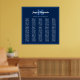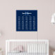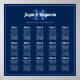 Gráfico de assentos azuis escuro e marinho de 32 polegadas quadradas com monograma inicial. Modelos de texto branco são fornecidos para listar dez nomes de convidados em cada mesa correspondente. Os cabeçalhos dos números da tabela estão em negrito e branco para corresponder à fonte usada para os nomes do casal no topo. Cada seção de mesa tem espaço para listar dez nomes fazer este gráfico pode acomodar 150 convidados ou mais se os nomes forem duplicados. As seções de mesa também podem ser excluídas para acomodar menos convidados. Um monograma inicial, em azul mais claro, é impresso atrás dos nomes no topo. Uma linha azul fina enquadra o gráfico inteiro.