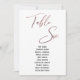 Esta simples e elegante design apresenta a "Mesa Seis" reproduzida numa letra moderna de escrita manual e embelezada com um efeito rosa-metálico falso-dourado. A fonte dos nomes pode ser alterada se você desejar. Assim como a cor de fundo. Os detalhes aparecerão na frente e no verso. 151 //