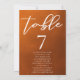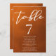 Siga a tendência de outono dos tons de terra com nosso número de tabela de casamento outono de gradiente queimado laranja a castanho com nomes. Simples tipografia branca num cartão rústico para um olhar minimalista. Matizes boêmicos que lembram argila de terracota destacam sua elegante caligrafia nesta marca de cor tendenciosa, de textura esbatida.
