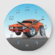 Um desenho animado de um carro de músculo americano super atraente! O clássico 70 é estilizante, linda tinta laranja corajosa, muito cromo e estourando uma roda.
