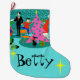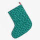 Esta família retro customizável que apara a meia do feriado da árvore de Natal contem cada tradição do feriado mas o fruitcake. Uma família dos desenhos animados dos anos 60 está em casa em sua sala de visitas moderna do meio século. Há uma parede de tijolo de turquesa e de cerceta e um vermelho, lareira do cone com um fogo rujir. O pai está vestindo um terno preto e um laço vermelho. Está pendurando meias verdes do Natal na chaminé da modificação com cuidado. Ao lado do pai, o júnior é empoleirado precària em uma cadeira alaranjada. Whoa! Fácil lá, júnior! Está alcançando para fora para pôr um ornamento sobre um kitchy, cor-de-rosa, a árvore de Natal que é já decked para fora com ornamento da cerceta e uma estrela amarela. No lado oposto da árvore, a mamã está guardarando um presente festiva envolvido. Hey, nenhuma agitação permitida! A mamã está vestindo um vestido vermelho brilhante do wiggle com guarnição branca. Igualmente está vestindo um chapéu do papai noel. Abaixo da árvore, há um gato preto lustroso que veste um arco vermelho. No assoalho, há um jogador gravado verde e preto cercado por álbuns coloridos do vinil. Você apenas sabe que a família está cantando junto com suas canções de natal favoritas do Natal quando forem decking os salões. Abaixo do design, dois, starbursts amarelos cercam o nome do proprietário da meia. O lado oposto da meia caracteriza um teste padrão do tijolo de turquesa e de cerceta.