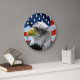 Custom Wall Clock tem uma foto próxima de Bald Eagle em frente à bandeira americana. Para aqueles que gostam de seus relógios sem números ou que desejam adicionar seus próprios a partir de compras de artesanato para ter um certo estilo.
