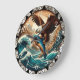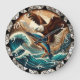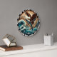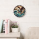 Este relógio de parede circular apresenta uma águia majestosa careca com asas estendidas, soprando acima de um oceano tempestuoso e segurando um peixe em seus talões. O fundo mostra montanhas robustas e um céu ensolarado. A face do relógio é delimitada por um padrão triangular preto e branco, que lhe dá uma estética forte, natural e selvagem.