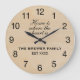 Um relógio personalizado que apresenta o sobrenome da família contra um fundo de madeira leve junto com o texto "Casa é onde está o coração". Este relógio personalizado faz um presente de excelente para qualquer ocasião. Disponível em três tamanhos.