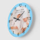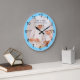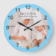 Um relógio de parede de acrílico divertido que certamente vai iluminar qualquer quarto. A borda externa é um anel azul claro, com números pretos. No centro há uma área para uma foto e um texto pessoais. A cor da borda pode ser personalizada.