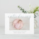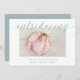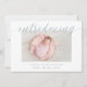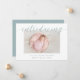 Os modernos anúncios de nascimento elegantes apresentam sua foto favorita de recém-nascido horizontal ou orientada à paisagem com "introdução" no topo em letras poeirentas de escrita verde caligráfica verde. O nome do bebê e as estatísticas de nascimento aparecem abaixo. Adicione mais seis fotos ao verso em um layout de colagem ou exclua para deixar o vazio.