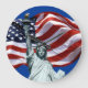 Mostre seu orgulho da América com a Estátua da Liberdade majestosamente em frente à Bandeira dos EUA em um céu azul claro.