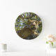 Lioness olhando da Tree para sua próxima refeição caminhando no chão abaixo dela em um relógio. com números negros de 1 a 12