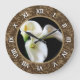Um rico modelou relógio com algarismos romanos virados e um trabalho de arte de lírios brancos.