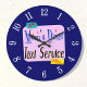 Um relógio de parede retrógrado da cozinha que lê "Diner e Serviço de Táxi para Mães, Open 24 7 Serving the Entire Community", em letras azuis de 1950 sobre um fundo de rosa claro, em um rosto azul com números brancos.
