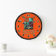 Um relógio de parede muito colorido com uma imagem de uma vela e alguns livros. O texto diz "Nunca é tarde demais para ler". O fundo é laranja brilhante. Este relógio seria excelente para um quarto para crianças, uma biblioteca, uma sala de leitura ou uma área de estudo. . Copyright Scarebaby Design.