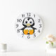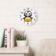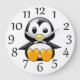 Relógio de parede com uma foto de um pinguim giro em um fundo branco.