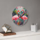Belo relógio acrílico redondo com 2 Flamingoes cor-de-rosa admirando-se. Estes 2 Flamingoes tropicais vão iluminar seu espaço com sua adorável vibração.