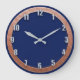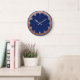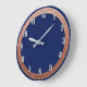 Números de mármore azul esculpidos flutuam acima de um anel de cobre falso e fundo azul marinho.
