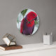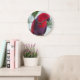 O relógio de parede com uma bela fêmea de papagaio Eclectus vermelho, ela ficou olhando para a câmera com sua cabeça para um lado. As fêmeas são vermelha e roxa. Os papagaios Eclectus vêm da Austrália.