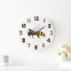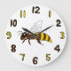 Um relógio com uma abelha de mel de cartoon e com números castanhos e amarelos.