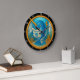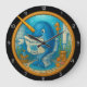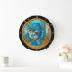 Esta imagem é um relógio de parede circular com uma borda preta e números brancos. A face do relógio apresenta uma ilustração esbranquiçada de um narval azul com uma bolota de ouro, vestindo óculos de ronco e lendo um jornal chamado "NARWHAL TIMES" enquanto se senta sobre uma sanita debaixo d'água. A cena submarina inclui paredes azuis, algas, estrelas-do-mar e um cavalo-marinho, com bolhas flutuando em torno da entrelinha, todas contidas dentro de uma armação interna do ouro.