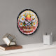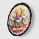 Este relógio redondo encantador apresenta um gnomo adorável sentado em uma cesta tecida cheia de margaridas brancas, tudo contra um fundo xadrez vermelho e branco. Um letreiro de "Boas-Vindas" adorna a cesta, adicionando um toque amigável. Este relógio caprichoso é perfeito para uma cozinha, berçário ou como um acento alegre em qualquer quarto, trazendo uma atmosfera deliciosa e convidativa.