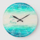Belo mar verde-azul pintado com ondas gráficas sobre a camada de luz romana relógio numeral romano. Uma bela praia, oceano costeiro inspirado, contemporâneo, relógio de casamento com um mar único estilizado, com aquarela manual, em um papel a cores de areia. Perfeito para um presente de casamento para o feliz casal recém-casado. Personalize este relógio de casamento com a sua própria noiva e nomes de noivos e o local e data de casamento. Projetada exclusivamente por Sarah Trett.