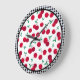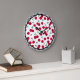 Este relógio de parede é feito com uma impressão de cereja com uma borda de verificação em preto-e-branco.
