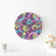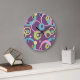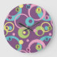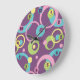 Um fundo roxo vibrante é adornado com um padrão estranho de círculos, pontos e anéis em uma variedade de cores brilhantes, incluindo rosa, verde, azul e amarelo.