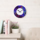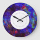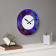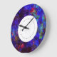 A parede moderna retém relógios num belo fundo de designer em tons de roxo, azul, vermelho e verde. Um design artístico que adiciona um toque de estilo artístico às suas paredes num pedaço de tempo que é eterno.