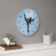 Ice Skater Design Wall Clock com um par de skates de gelo brancos sobre um fundo gráfico de gelo azul, com texto personalizável.