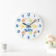 Personalize este relógio com um nome. As mãos pequenas são coloridas em amarelo, laranja, azul e verde. Os números estão em azul.