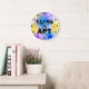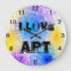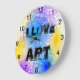 Legal relógio grande de parede redondo com círculos espirais coloridos em azul claro, roxo e amarelo brilhante sobre fundo branco. Com o texto, eu adoro arte num texto negro divertido sobre fundo branco. Relógio divertido para um quarto, sala de jogos, sala de arte escolar. Trabalho de arte gráfico original por TamiraZDesign. Visite minha Loja para ver mais itens originais: www.zazzle.com/tamirazdesigns*